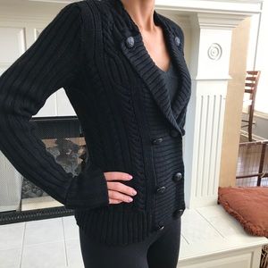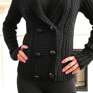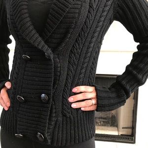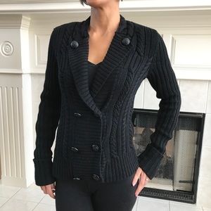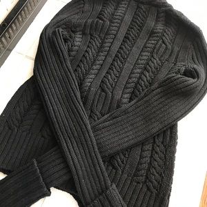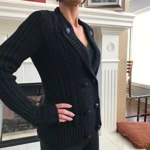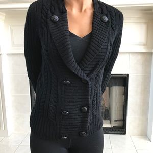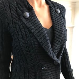 Beautiful v-neck sweater in pristine condition, used only a few times. Elongated sleeves to be used folded. Braid pattern in the front. Double-breasted front with intricate buttons.