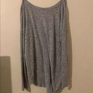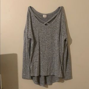 Grey sweater with cross cross in the front the back is longer than the front of the shirt