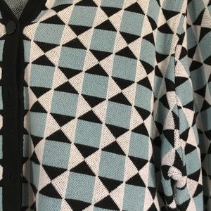 Button down sweater/jacket; 3/4 sleeves with button accents at wrist; collared neckline; excellent condition. Colors or sky blue/black/white.