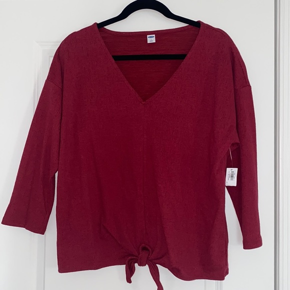 Deep red, 3/4 length sleeves, tie up front, lighter than a sweater.
