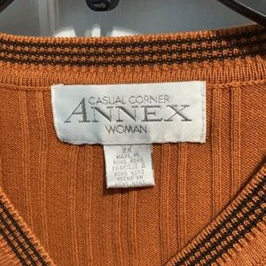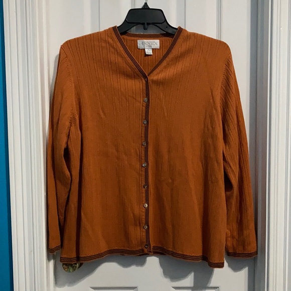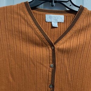 Burnt orange button down sweater. Black detail along the edges. Pretty buttons