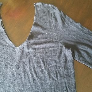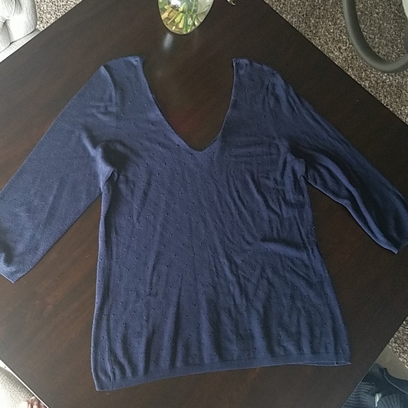Has a deep V in the front and back. Light weight. Dark Navy Blue.