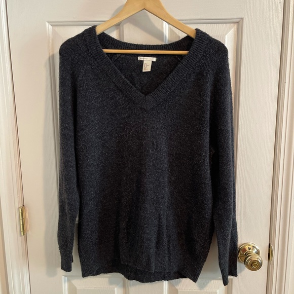Dark gray vneck sweater. Worn but just needs shaved.