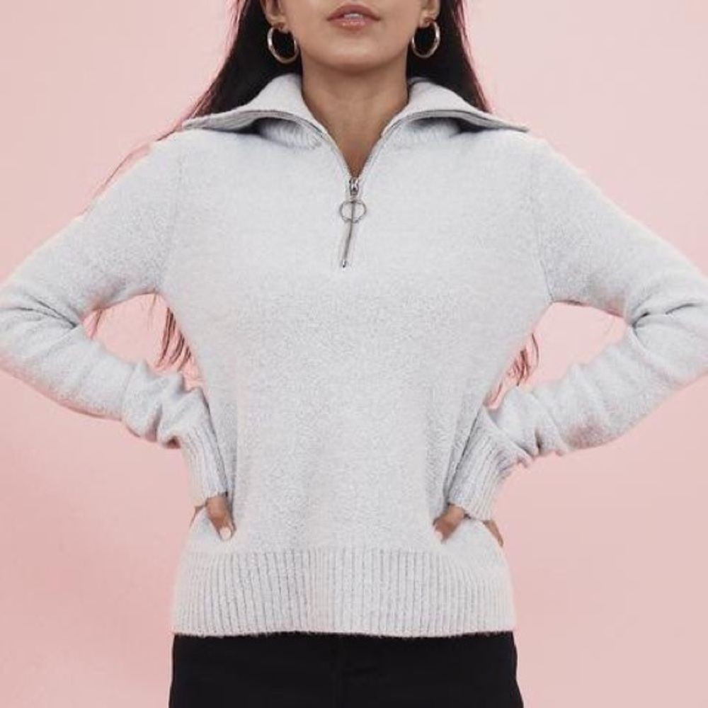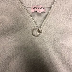 Never worn! This is a super cute, comfy grey colored sweater. The brand is Cry Baby. Size is small but will fit XS through medium. Super soft and very comfy. The quality is amazing. You can wear in it many different ways! It’s a very trendy piece that’s all over Pinterest. Perfect for cold summer nights and fall. Looks good with everything. No longer on the website. #comfy #cozy #sweater #90s #trendy
