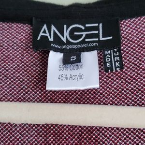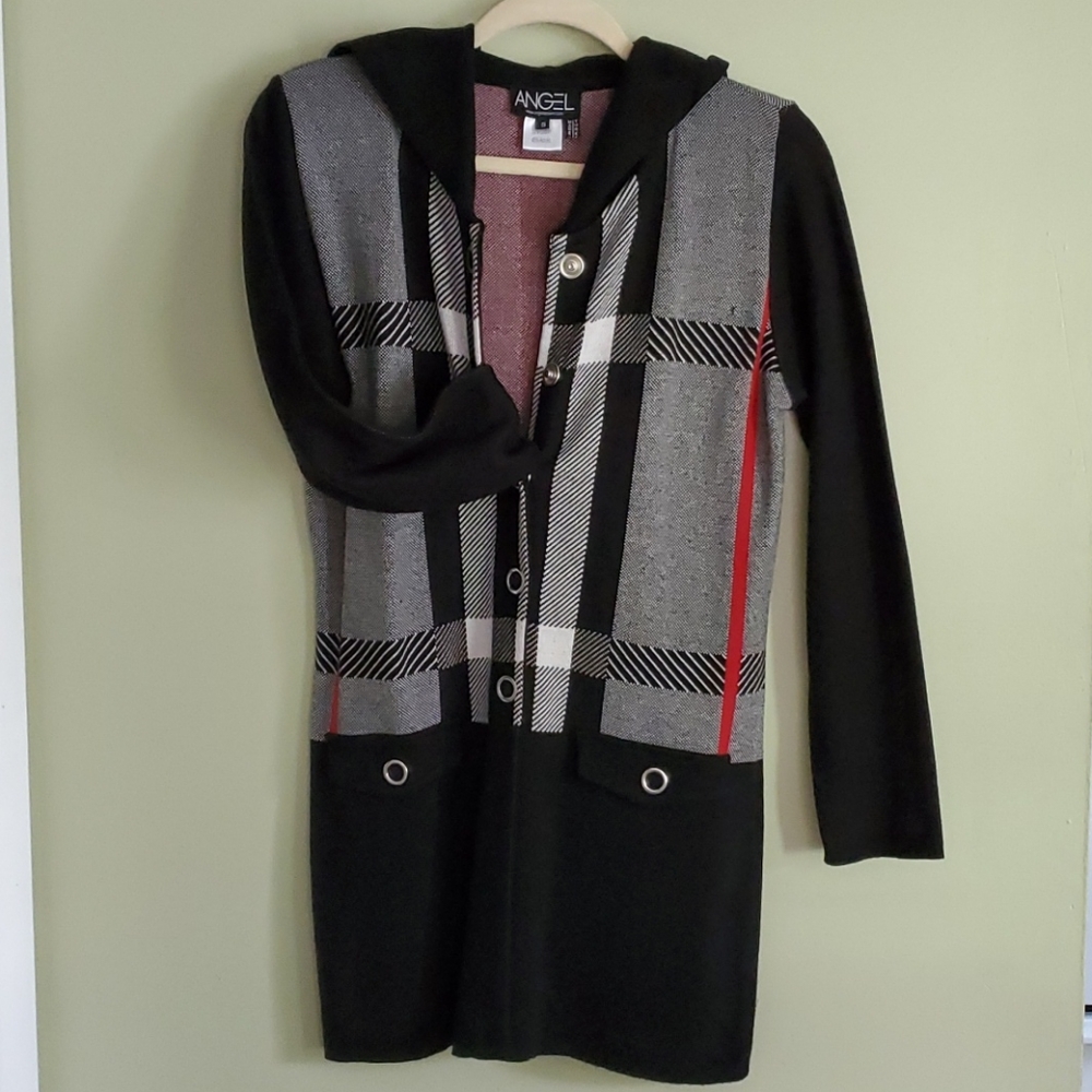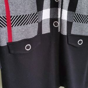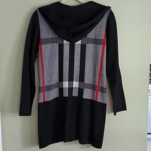 Black, red and white knit sweater with front 2 faux pockets. Snap down the middle, above knee length. Looks adorable with jeans and/ or dress pants or even with tights as a sweater dress. Very versatile!! A must have!!