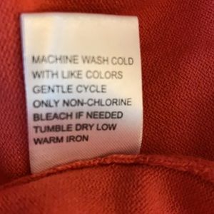 Button down cardigan that is machine washable. Very soft and comfortable. The color is a light rust/orange.