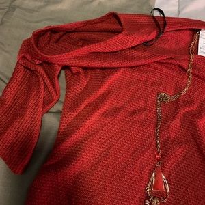 Lightweight sweater w/necklace attached, can unclip for washing. Does have open shoulders and sides are cinch.