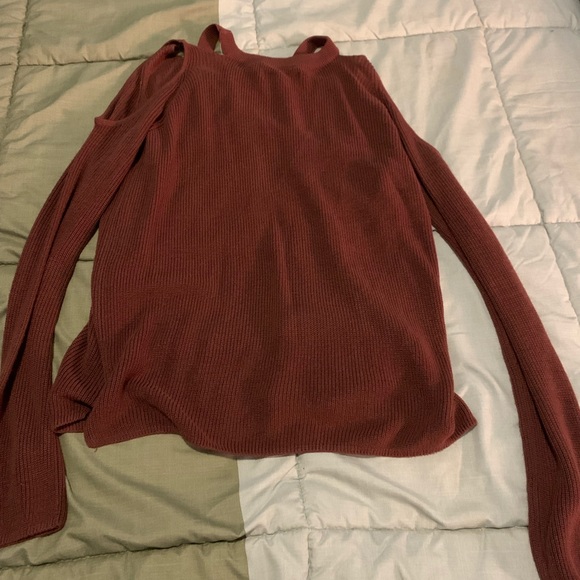 Worn a couple times. Sweater with open shoulders. Cute with leggings and big scarf! Very comfortable. Like a dark mauve pinkish color