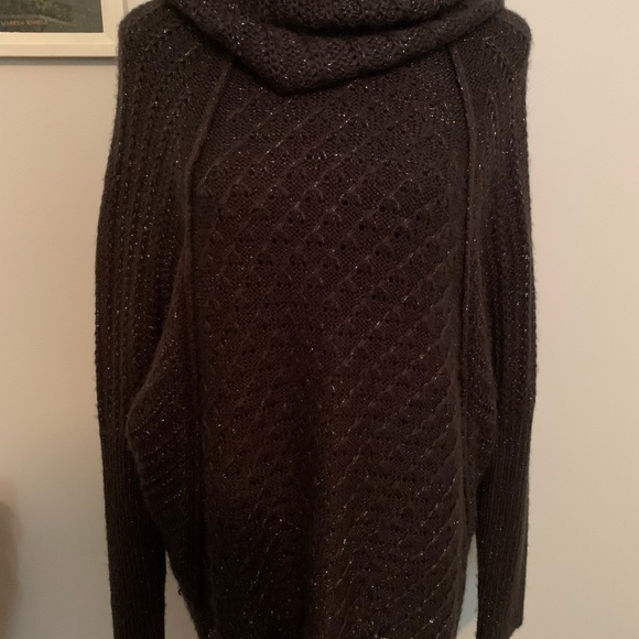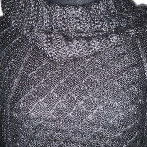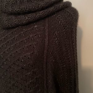 Dark gray cowl neck sweater with metallic threads throughout. 26” from neck to bottom.