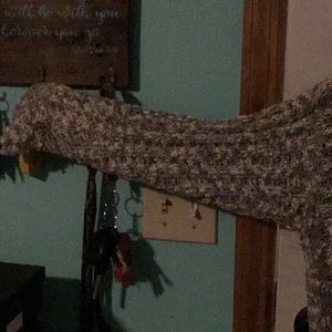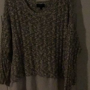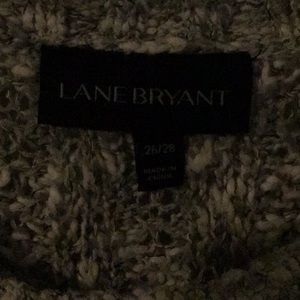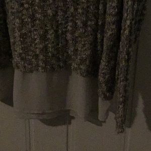 Lane Bryant sweater with soft, thin off-white bottom giving the illusion of a blouse underneath. Sweater is gray and off-white with a rounded neck. Long sleeves with stretchy cuffs. Measurements are 30 inches shoulder to bottom, 31 inches pit to pit, and 18 inches sleeves. Good used condition but not worn much. It’s very warm.