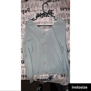 Very cute sweater worn one time. The buttons do go in the back but can be worn either way. And does fit bigger