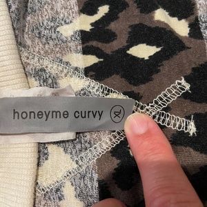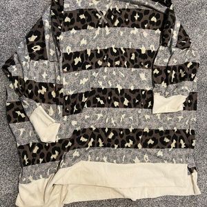Animal print long sweater. Covers the rump. Sleeves are about elbow length. Tans, browns, black
