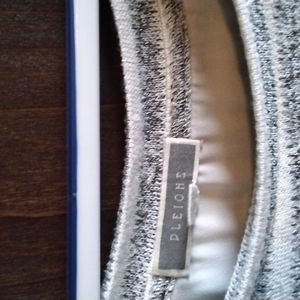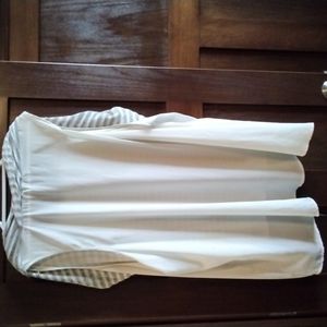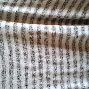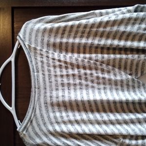 Light weight grayish and white stripes with a ight polyester blend tank top underneath. Back splits and is shorter to give additional texture and flare to the top.