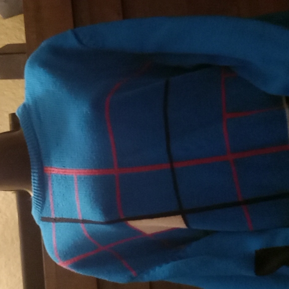 Turquoise blue sweater box tac toe stripe pink and black with one white box. Size XL