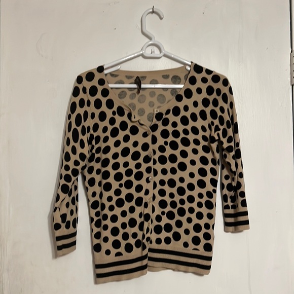 Black Polkadotted and tan striped sweater! It was grandmothers and she is ready to pass it on to the next person!