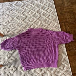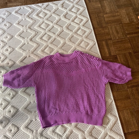 Cute crochet 3/4 sleeve sweater. Nice button details on the shoulder. Nice fall sweater!