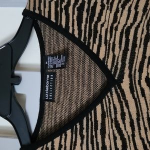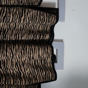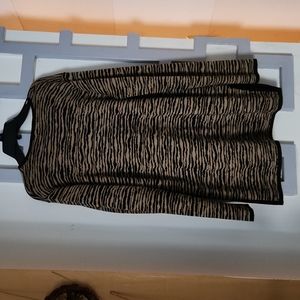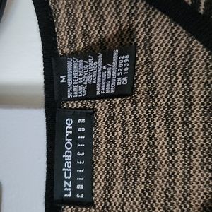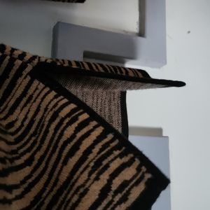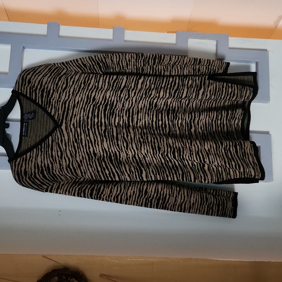 Black and tan striped sweater with black trip on end of sleeves, bottom and sides.