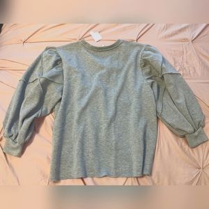 Never worn sweater. Got as birthday gift. Medium size, fits baggy. Sleeves are puffy. Very thick material. 49% PolyEster. 45% Rayon. 6% Spandex.
