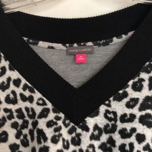 V neck black and gray sweater shorter in front, longer in back, 22 inches pit to pit, 25 inches Length in front 29 inches in back very soft fabric, beautiful over leggings.