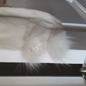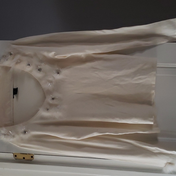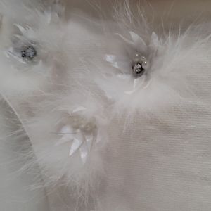 white lightweight small v neck sweater has little furry flowes with stones in the middle lining the neckline on one sleeve near the wrist there are two furry flowers dress yp or down soft and cozy very feminine look