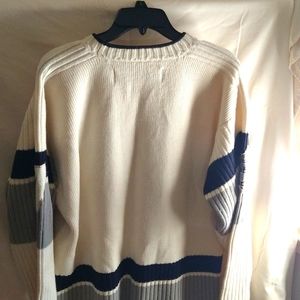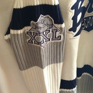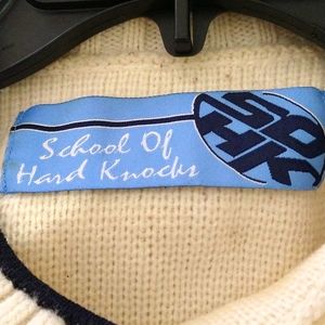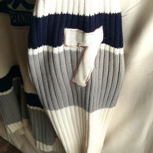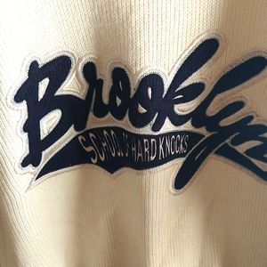Brooklyn school of hard knocks sweater with side splits. cream grey and black logos on sleeves and front. I wore as a sweater dress with thigh high boots, it's unisex