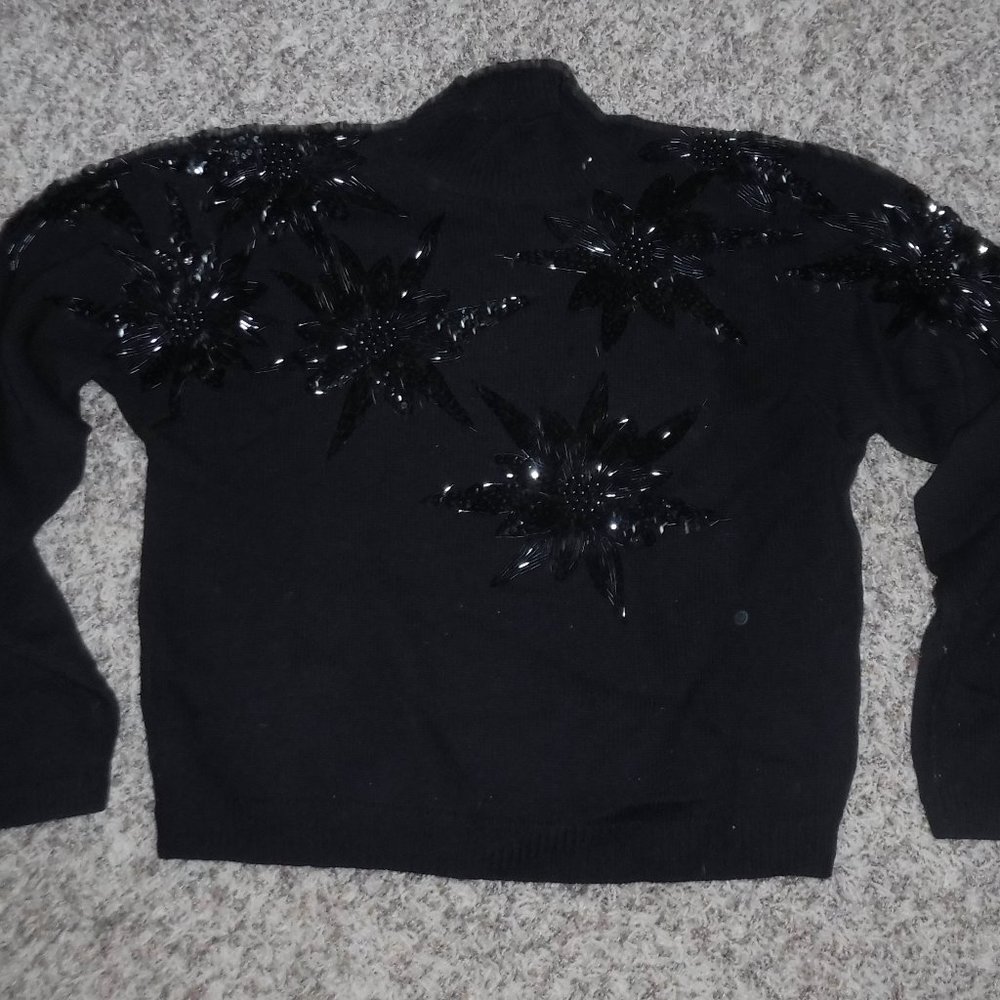Black sweater with decorative black beading in shape of flower over upper portion and shoulders. 100% Wool, Size small