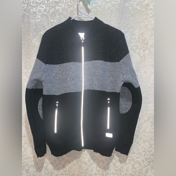 Men grey and black long sleeve sweater zipper front pockets have zipper also reflective zipper