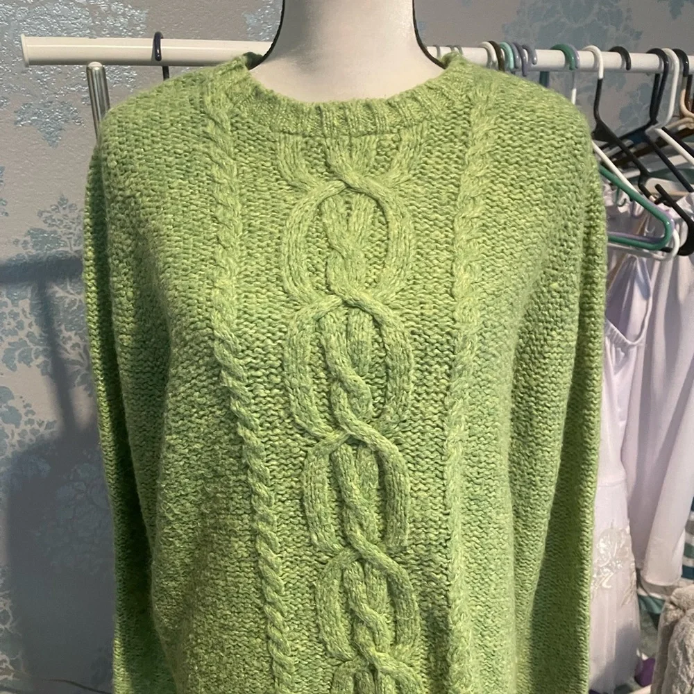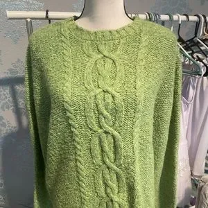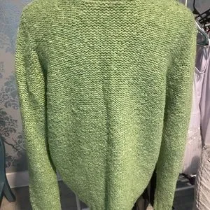 Green sweater with scroll detail on the front. Soft to the touch. The color is a heather look to it ( mix of green with a little white).