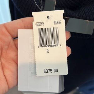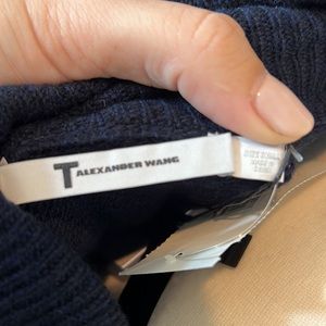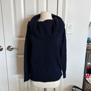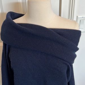 Navy wide cowl neck sweater with options to wear exposed shoulders, one shoulder or just loose cowl, size small, never worn, 90 wool / 10 cashmere