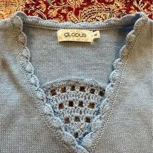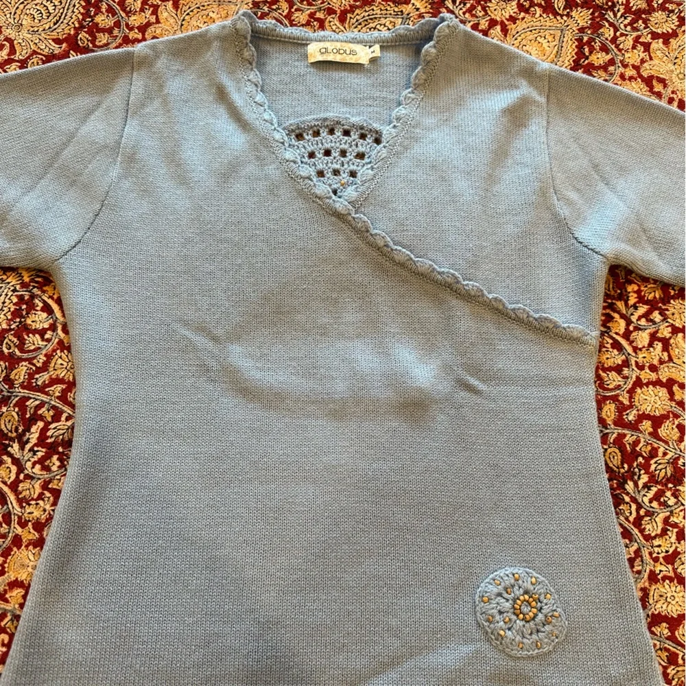 Light blue sweater with beautiful detailing. The back is very unique. Indian brand; Never Worn; Size M, but fits me usually XS. Reach out if you need additional details.