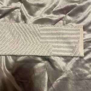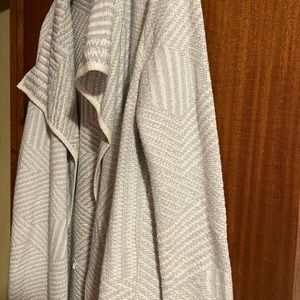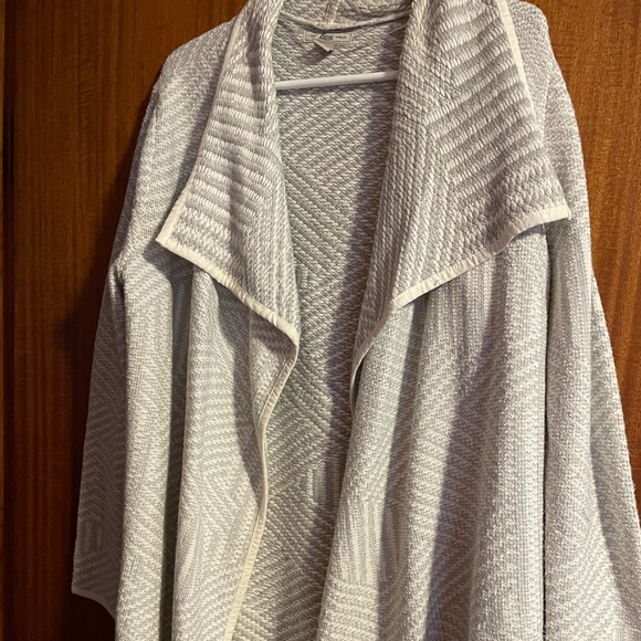 Gently worn light grey/white heavyweight cardigan. It has a shawl collar. The cardigan measures 32 inches in length and has set in sleeves. 83% acrylic-17% polyester. Hand wash cold—dry flat