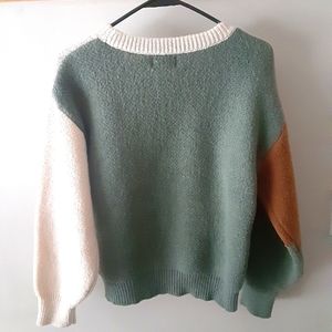 Gently pre-owned sweater. size small. Universal Thread. cute & cozy. has a small pill on front and one arm has a light mark-see last pic. I'm not sure if it came like that or if it's an imperfection. hard to see it either way.