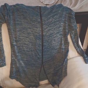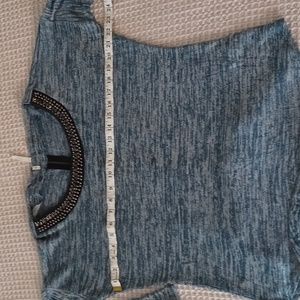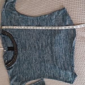 studio y, size small. denim blue/lt. blue mix tones with black collar, bead accent. functioning zipper detailed on back. light weight, great with black or white jeans.