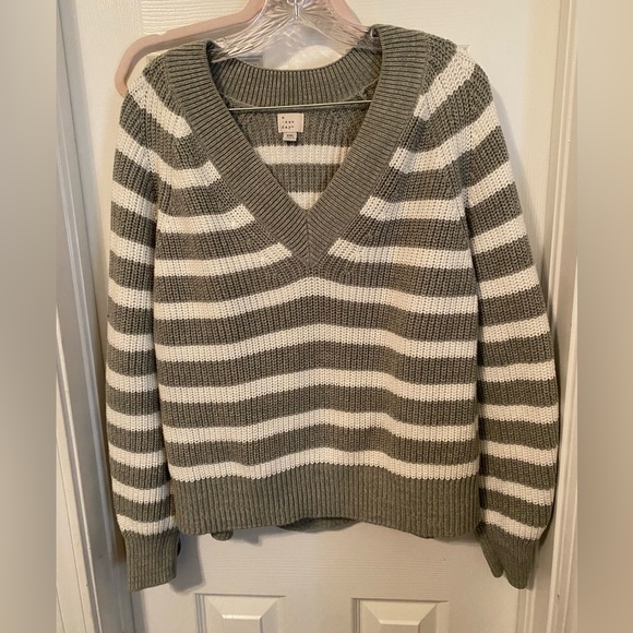 Sweater with grey and white stripes , never worn, slight ballon sleeves