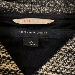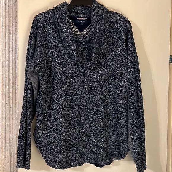 Nice Tommy sweater with multiple colored sleeves and cowl neck. Size large.