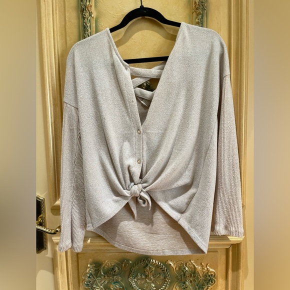 V-neck button down super soft material tie in front criss cross on back.