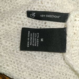 Details: this sweater is long sleeve, on the sheer/thinner side and has thin fring around the bottom. It has brown and grey strips on the front but it is plain cream on the back. Has been worn but no sign of wear.