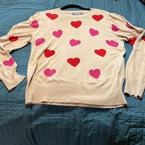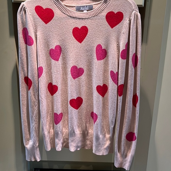 Tan lightweight sweater with puffed sleeves and pink hearts. Rayon and Nylon