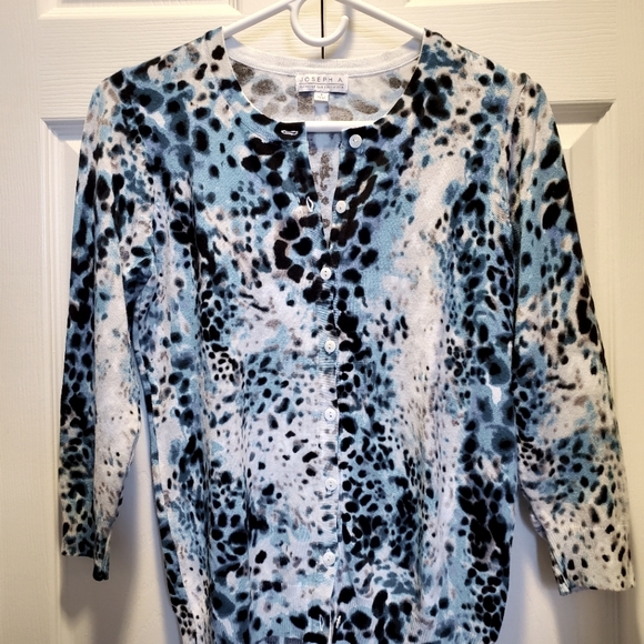 3/4 sleeve fine knit sweater by Joseph A. Colors are black, blue, white and beige.