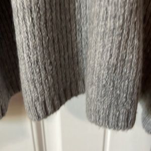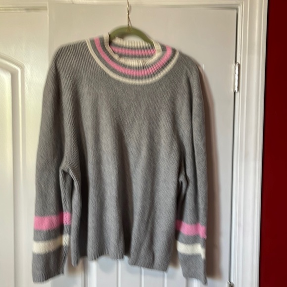 Pop sugar 1x gray sweater, long sleeved, round neckline. Pink and cream striping detail on sleeves and neckline,