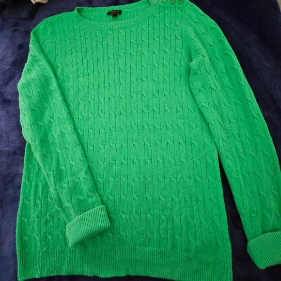 Kelly green 70% nylon and 30% lambs wool shoulder to neckline button opening by Talbots.