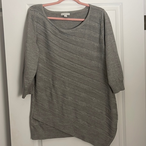 New York and Company gray with silver threads through it size extra large asymmetric in the front. Super cute.