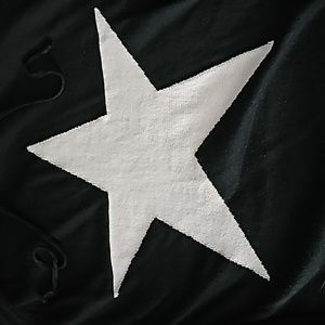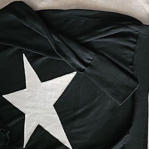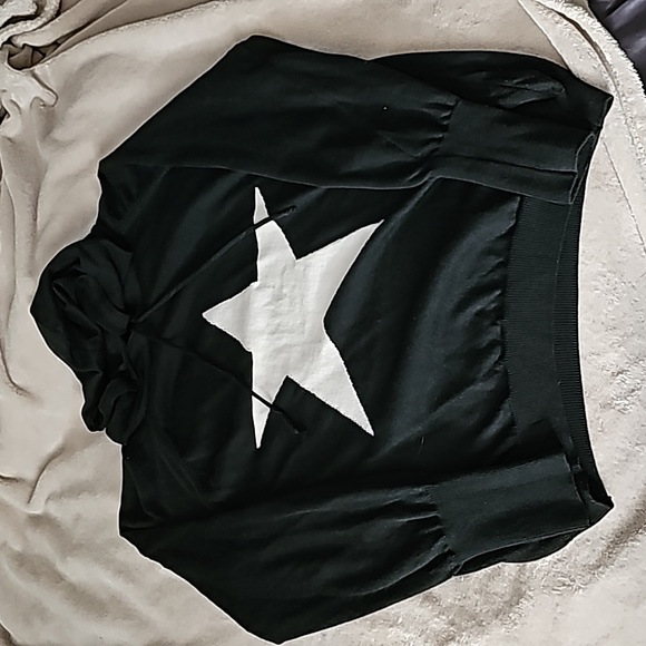 adorable super soft black sweater with hood, off white star on front, plain back, rubbed knit hem and cuffs, seamless shoulder seams.