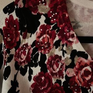 Scoop neck, snap closer, rose motif with rhinestones set in roses with 3/4 lengths sleeves. 89% rayon 31%nylon