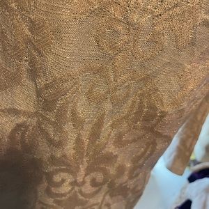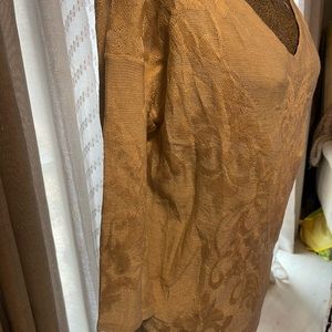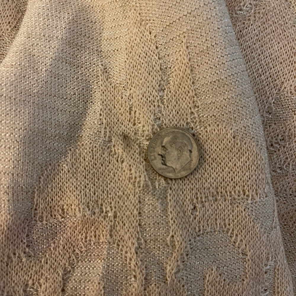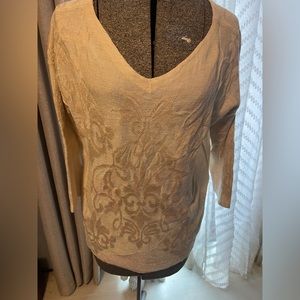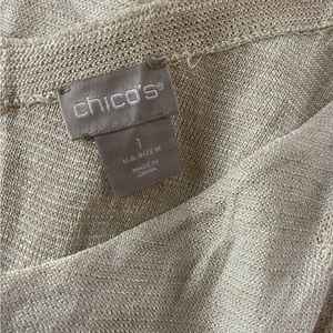 Very pretty sweater with a tinge of sparkle thread. Worn once. Three quarter sleeve. Worn once. Tiny spot on front. I have not tried to get it out. Chicos size one, that is comparison to a size medium or size 8