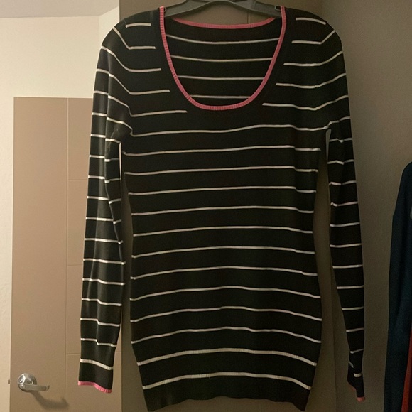 Lightweight sweater. Stripes. Grey,white and pink. Lighly worn. Round neck