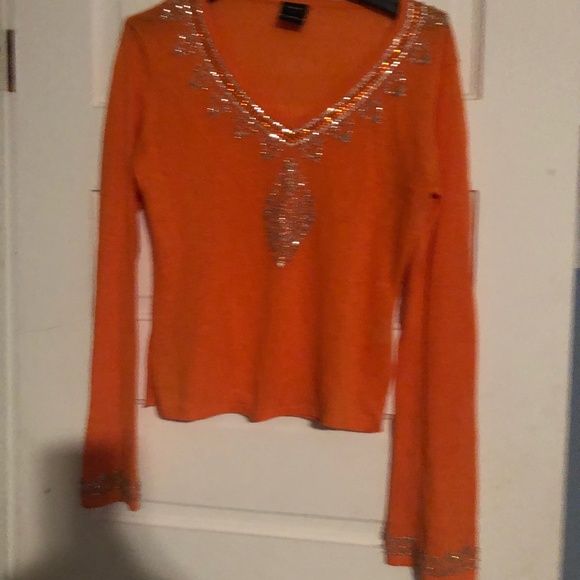Knit sweater in tangerine with sequin neck and sleeve decoration. Used. Size M Fubu
