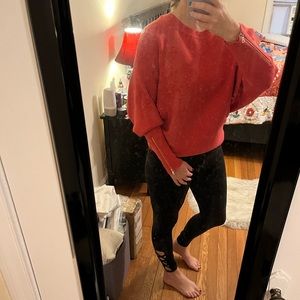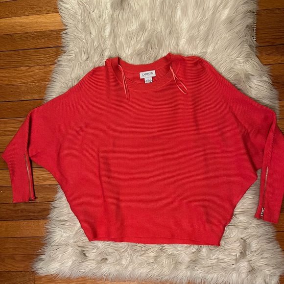 Gold zippers on sides of sleeves. Sweater is a bright coral color (not red). Only worn once! In great condition. Size M, for reference I am 5’3” 130lbs. 52% viscose, 28% poly 20% nylon.