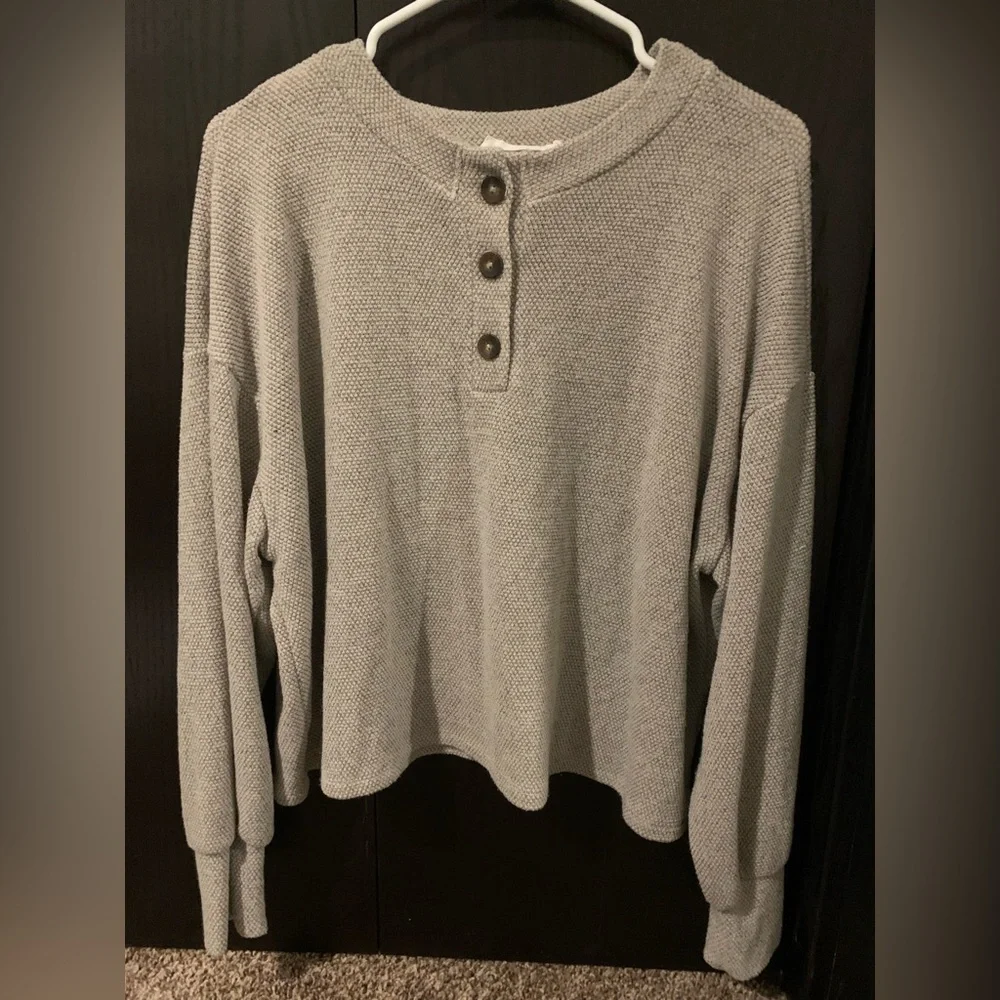Tan, light weight sweater from Dry Goods boutique. Warren a handful of times. It’s in great condition.