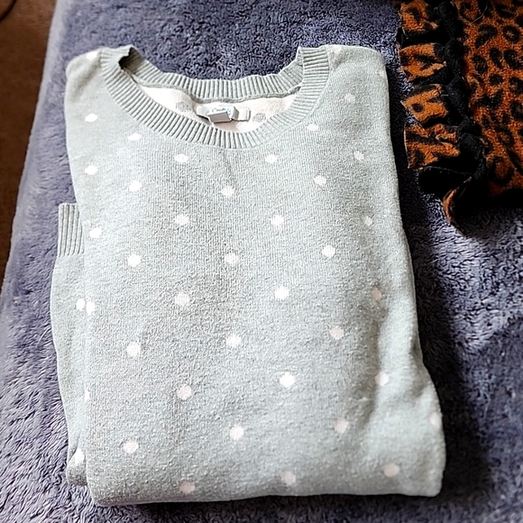 grey sweater with white poka dots. heavy and thick. has some stretch and long sleeved. length sits below the waist.